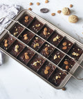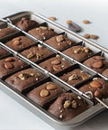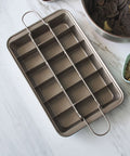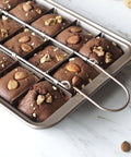 Professional non-stick brownie pan featuring a removable 18-slot divider and heat-resistant metal construction for perfectly shaped, evenly baked treats.