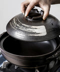 This pot is suitable for use on gas stoves for preparing soups, stews, ramen, and seafood. Hand washing is recommended to preserve the brushed glaze finish and the ceramic integrity over time. Always ensure the air-vent hole is clear to maintain stable internal pressure during cooking.