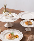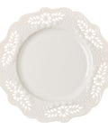 An elegant, handcrafted porcelain serving collection featuring intricate lace-embossed rims for a sophisticated, vintage-inspired table setting.