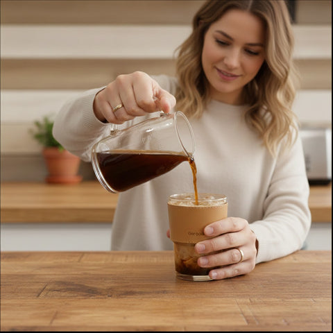Hand wash recommended to preserve the sleeve's texture and glass clarity. Ideal for cold beverages like juices, iced coffee, and smoothies.