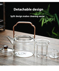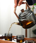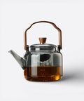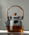 Combining natural wood textures with crystal-clear glass, this teapot serves as a sophisticated centerpiece for any modern kitchen or office.