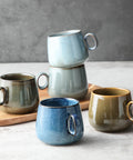 Modern rustic high-fired ceramic coffee cup featuring a unique reactive glaze and ergonomic handle for a curated beverage experience.