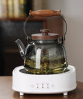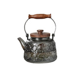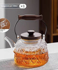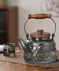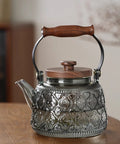 A 1000ml heat-resistant borosilicate glass teapot featuring vintage-inspired embossing and ergonomic wooden accents.