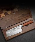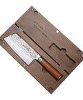 Handmade 9cr18 kitchen knife featuring a hammered blade finish, Macassar ebony handle, and a protective wooden gift box.