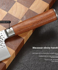 The handle is constructed from Macassar ebony, providing a dense and durable grip that is balanced for comfort during extended periods of daily kitchen use.