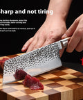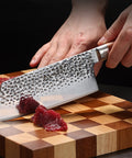 The Wudy Handmade Kitchen Knife is designed for efficient chopping and slicing tasks. Forged from 9cr18 metal, the blade features a hammered finish to reduce food sticking during use. It is equipped with a Macassar ebony wood handle for a steady grip and is packaged in a fitted wooden storage box for protection.