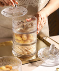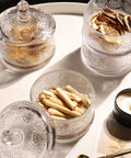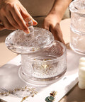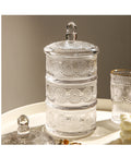Stackable 3-tier embossed glass storage jar featuring intricate European detailing and a dust-resistant fitted lid for versatile home organization.
