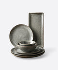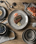Premium porcelain dinnerware featuring a modern stone grey finish, earthy texture, and a complete range of sizes.