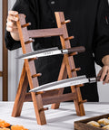 Material: Genuine Sapele Hardwood. Design: Multi-tier vertical rack. Capacity: Accommodates multiple knife sizes. Finish: Natural, hand-polished wood.