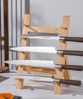 Designed for chefs and home kitchens seeking both practicality and aesthetic appeal, this solid wood knife storage rack provides a stable, elegant way to organize and display your most essential blades. Made from durable sapele hardwood, it features a multi-tier structure that accommodates various knife sizes while keeping them easily accessible. Its natural finish brings a warm, minimalist style to any countertop, combining function and craftsmanship in one refined piece.