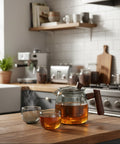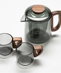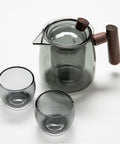 A refined tea collection crafted from smoke-tinted borosilicate glass with elegant wooden handles. Blends minimalist design with heat-resistant durability for an elevated brewing experience.