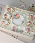 Luxurious 45% Bone China tea service featuring delicate floral artwork, hand-finished gold handles, and a lightweight, translucent structure for elite tea rituals.