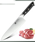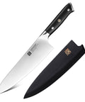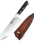 High-carbon stainless steel chef knife featuring an ergonomic handle, balanced weight for accuracy, and an included protective storage sheath.