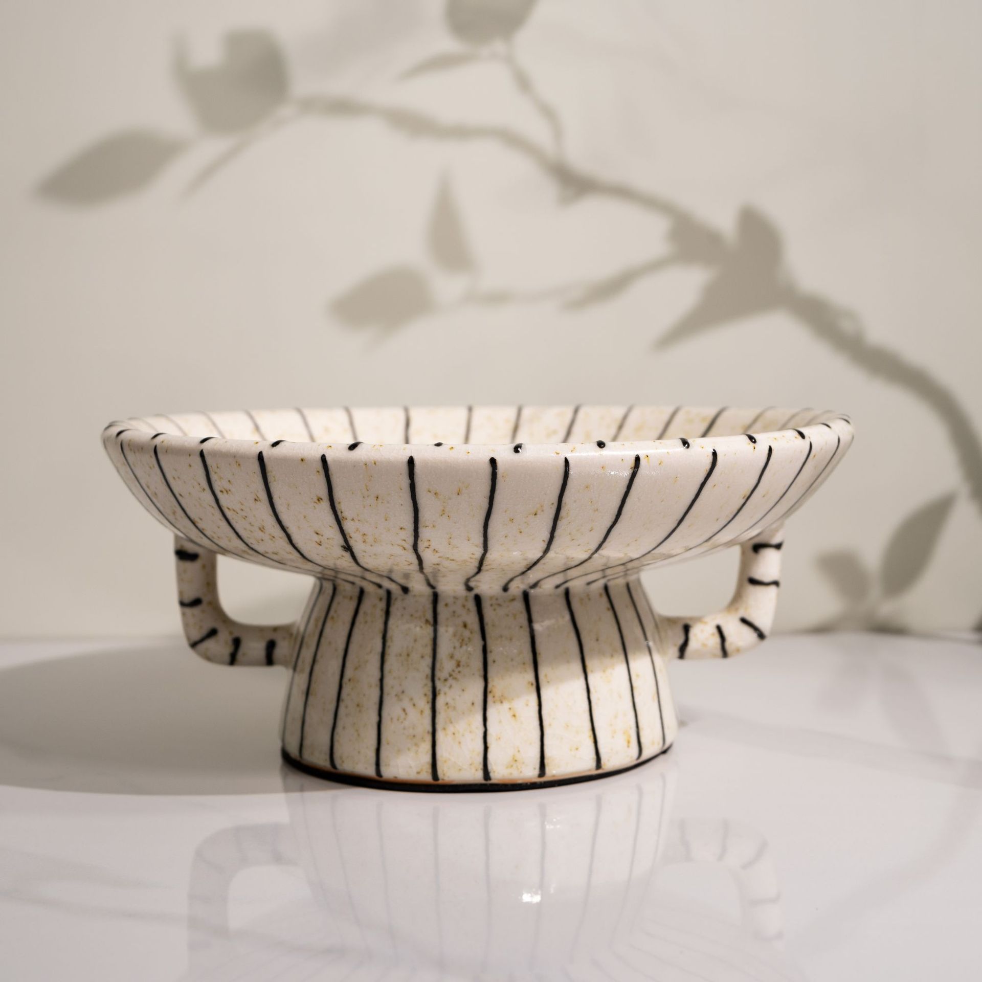 Its bold striped texture and pedestal form bring a modern-retro aesthetic to any table.