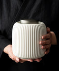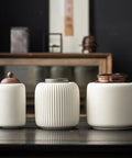 Each canister features an elegant ribbed ceramic form and a handcrafted colored glaze, bringing a sense of calm, timeless luxury to your countertop or tea ceremony setup.