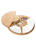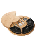 Elegant 13-inch round bamboo charcuterie board featuring three removable ceramic serving dishes and a hidden drawer with a 4-piece professional stainless steel knife set.