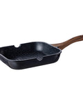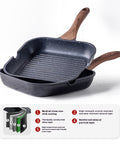 Premium 26–28 cm grill pan featuring a 5-layer medical stone non-stick coating, deep-ridged flavor-locking surface, and an ergonomic wood-grain handle compatible with all stovetops.