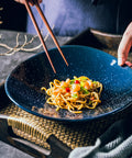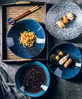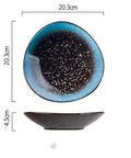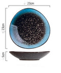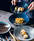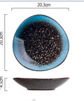 The specialized color-glaze technique creates a striking contrast between the deep tones and speckled textures, ensuring that each plate carries its own distinct artistic character.