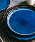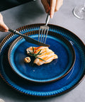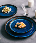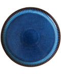 A minimalist round plate featuring a deep blue glaze and a sophisticated striped edge, crafted from durable porcelain for every occasion.