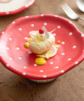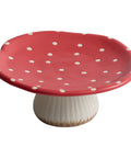 Whimsical 8.7-inch mushroom-shaped ceramic dessert pedestal featuring a vibrant red polka dot design and a smooth white base for artistic tea-time service.