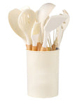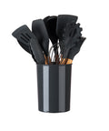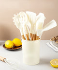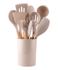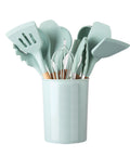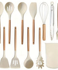 Modern 11-piece silicone utensil set featuring heat-resistant heads, ergonomic natural wooden handles, and a non-scratch design safe for all cookware.
