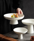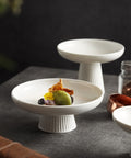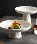 Contemporary white ceramic pedestal plate featuring a refined ribbed base design, perfect for elevating fruit, dessert, and gourmet food presentations.