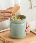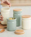 Minimalist Nordic ceramic storage jar featuring an airtight natural bamboo lid and a durable, odor-free body available in two practical sizes.